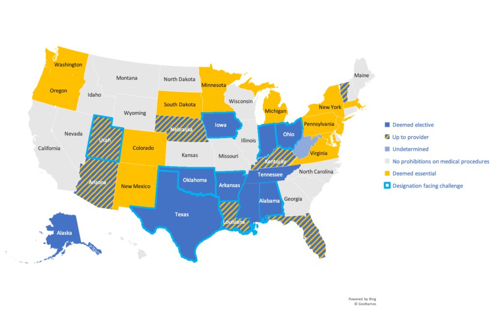 Below is a summary of the states that have classified abortions as “elective” during the pandemic and states that are facing challenges to these determinations in court.