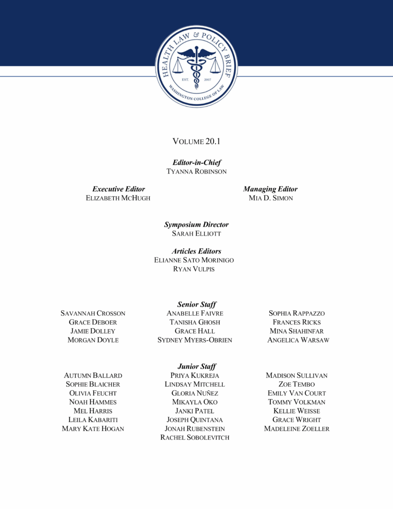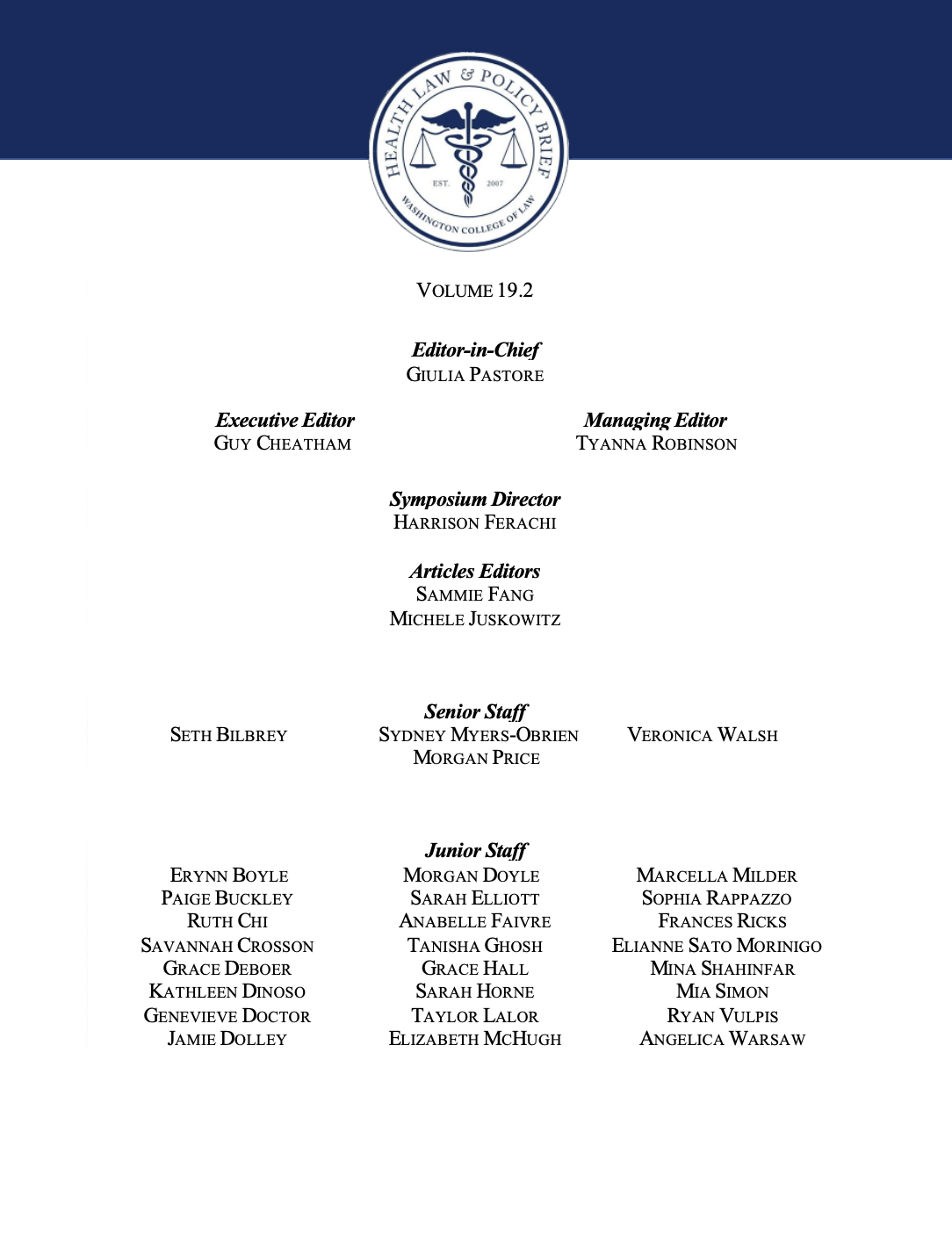 JOIN OUR TEAM The Health Law & Policy Brief accepts applications bi-annually from Washington College of Law students. To apply, email your resume and brief interest statement to: healthlawandpolicybr@wcl.american.edu. Volume 20 Masthead